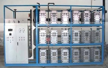 3、预处理→一级反渗透→加药机(PH调节)→中间水箱→二级反渗透(正电荷反渗膜)→纯水箱→纯水泵→EDI装置→紫外线杀菌器→0.2或0.5μm精密过滤器→用水对象(≥17MΩ.CM)(新工艺)
