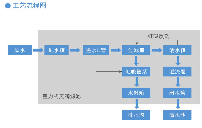 重力式无阀滤池由分配水槽、进水管、过滤室、集水区、连通管、冲洗水箱、溢流槽、虹吸上升管、虹吸下降管、虹吸辅助管、抽气管、排水水封箱、虹吸破坏管、虹吸破坏斗、强制虹吸装置、强制破坏装置等组件构成,是集水力学、结构学、空气动力学为一体的净化水装置。