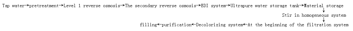 Raw water to the original water tank, pump to the sand filter, activated carbon filter - scale inhibitor dosing - 5 mu precision filters - > level high-pressure pump - level of membrane treatment system - level RO water tank to the secondary high pressure pump, the secondary membrane processing system to secondary RO - RO water tank, EDI into the water pump to EDI device, pure water to pure water pump, mixing tank