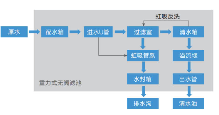 重力式无阀滤池由分配水槽、进水管、过滤室、集水区、连通管、冲洗水箱、溢流槽、虹吸上升管、虹吸下降管、虹吸辅助管、抽气管、排水水封箱、虹吸破坏管、虹吸破坏斗、强制虹吸装置、强制破坏装置等组件构成,是集水力学、结构学、空气动力学为一体的净化水装置。