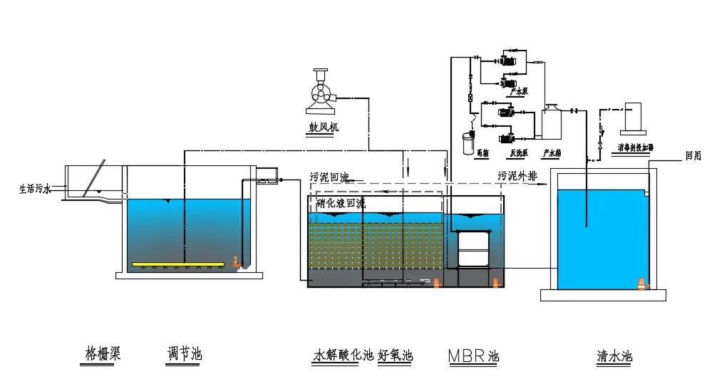 MBR装置利用有机超滤膜负压抽吸出水,截留微生物菌群,使生物量维持在高浓度,防止菌群流失,使容积负荷提高,同时膜分离的高效性使处理单元的水力停留时间缩短。