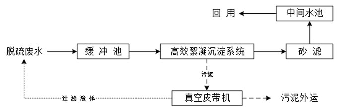 用于脱硫的循环水主要目的是去除烟气中的二氧化硫和氮氧化物等物质,所以对回用水质没必要过于高,鉴于此我们使用如下工艺即可满足使用要求。脱硫废水中水回用、零排放工艺: